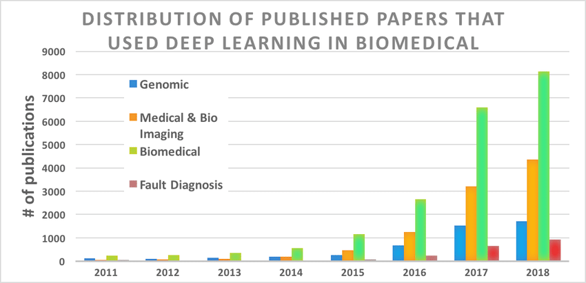 Le Deep learning existait déjà depuis les années 1990, mais ce n'est que vers la fin des années 2010 qu'il a connu une croissance et une expansion fulgurante. Comme en témoigne la courbe ci-dessous qui montre le nombre d'articles de recherche dans le domaine biomédical qui ont utilisé le deep learning.