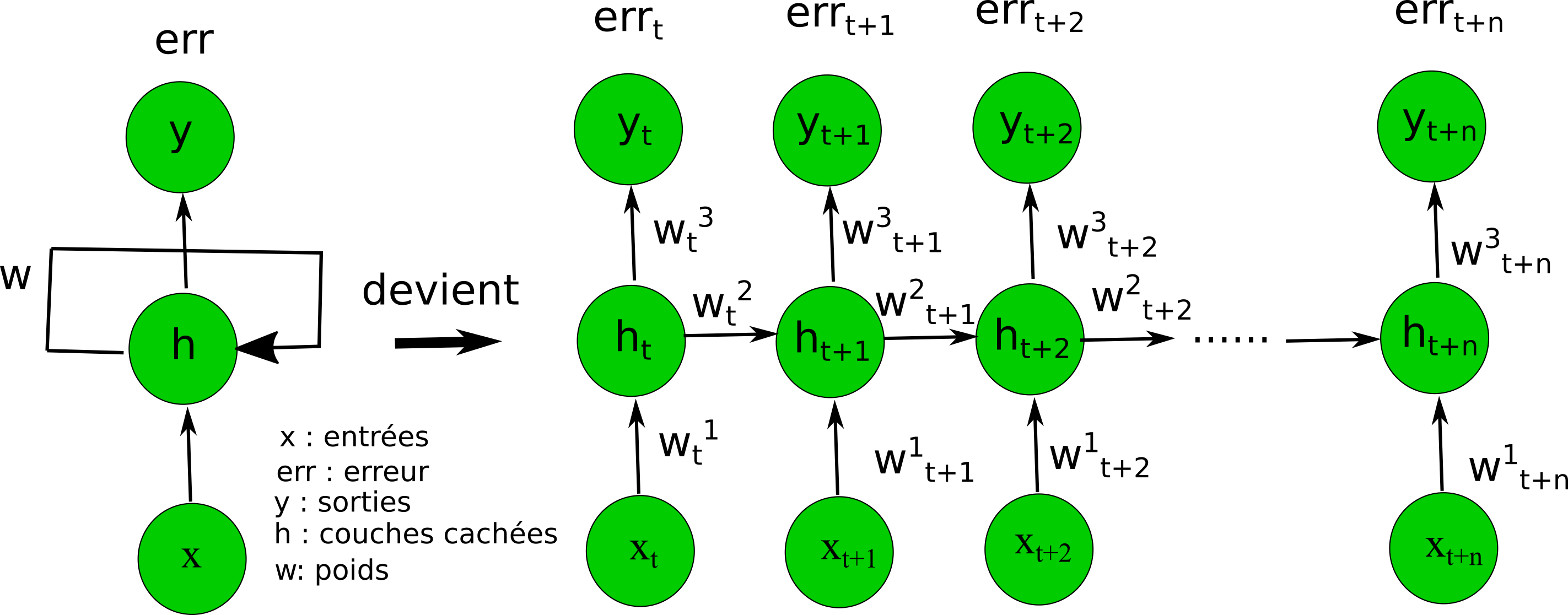 Les réseaux de neurones récurrents sont des réseaux utilisés pour des taches de reconnaissance et de génération de séquence. Une séquence peut être un mot, une phrase, un texte, une action ( marquer un panier au basket), une musique, etc. La particularité de ces réseaux est le fait qu’il intègre une mémoire afin de se rappeler des informations qu’ils ont reçues en entrée auparavant.