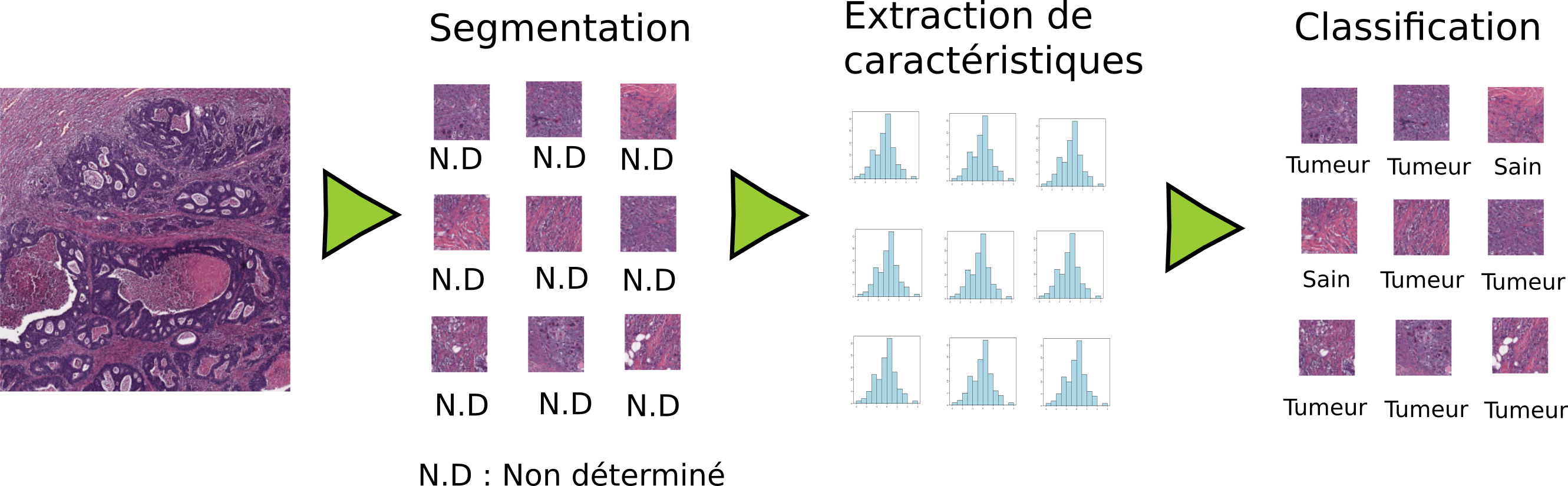 La segmentation est l’étape durant laquelle les objets d’intérêt sont détectés puis extraits de l’image. Dans le cas ci-dessus la segmentation a simplement découpé l’image du tissue qui à l’origine mesurait 5000*5000 pixels a été découpé en sous-image de 50 x 50 pixels. Le but de cette segmentation est probablement de savoir avec précision jusqu’ou le tissu a été infecté par la tumeur.