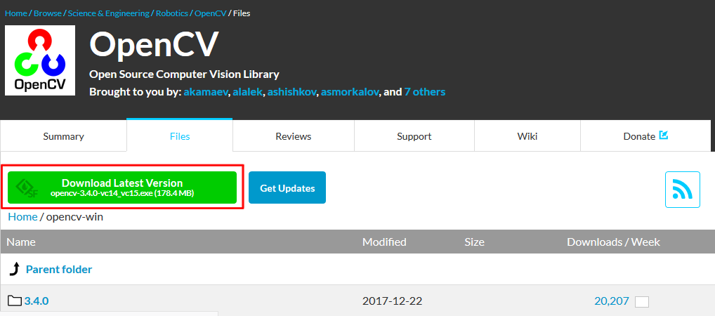 Après avoir installé Visual studio, vous trouverez via ce lien : https://sourceforge.net/projects/opencvlibrary/files/opencv-win/, la version la plus récente d’openCV.