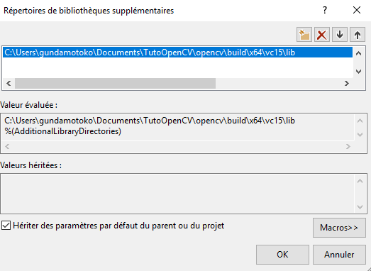 La procédure afin d’inclure,les fichiers .lib est similaire à celle que l’on à utilisée pour inclure les headers, je ne la reprendrais donc pas en entier. Cliquez sur la flèche du champ « Répertoire de bibliothèques supplémentaires », appliquez la même procédure qu’avec Include sauf que cette fois il vous faudra indiquer le chemin menant au répertoire « lib »d’OpenCV tel que montré ci-dessous.