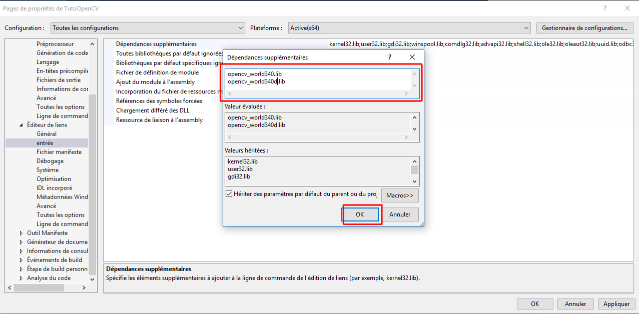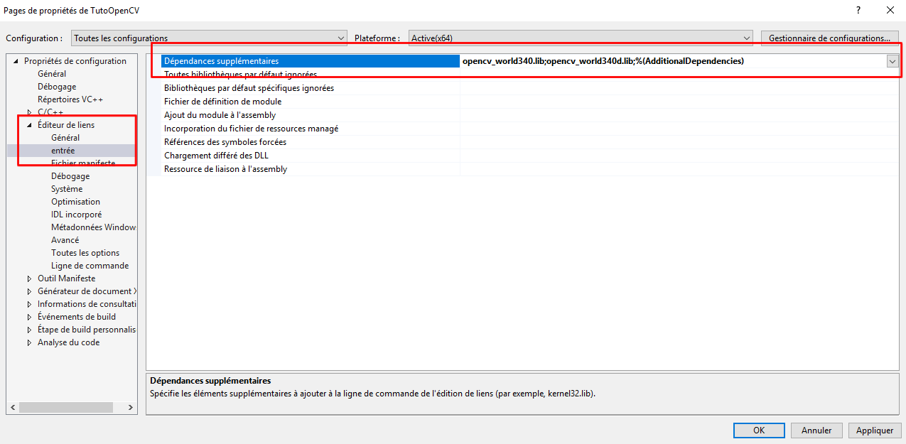 Une fenêtre comme celle-ci dessous apparaîtra, dans le champ libre tapez les dépendances suivantes « opencv_world340.lib » et « opencv_world340d.lib » comme ci-dessous. Cliquer sur « OK » puis sur « Appliquer ».