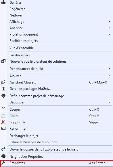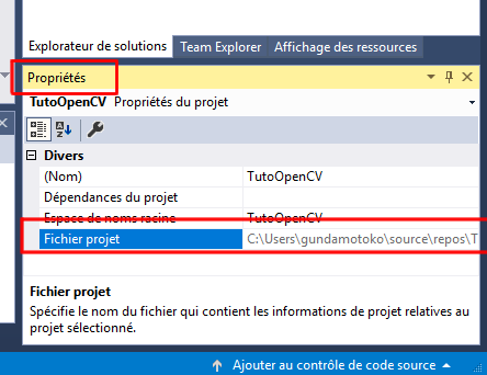 Pour finir, complètement cette intallation, rendez-vous dans votre Répertoire OpenCV, puis dans build→x64→vc15→ bin . Copiez tous les fichiers .dll dans le répertoire x64 de votre projet Visual studio. Si vous ne vous souvenez plus dans quel répertoire vous avez créé le projet, vous pouvez facilement retrouver celui-ci dans l’onglet « Propriétés », tout en bas à votre droite. Le répertoire du projet est indiqué dans le champs « Fichier projet ».