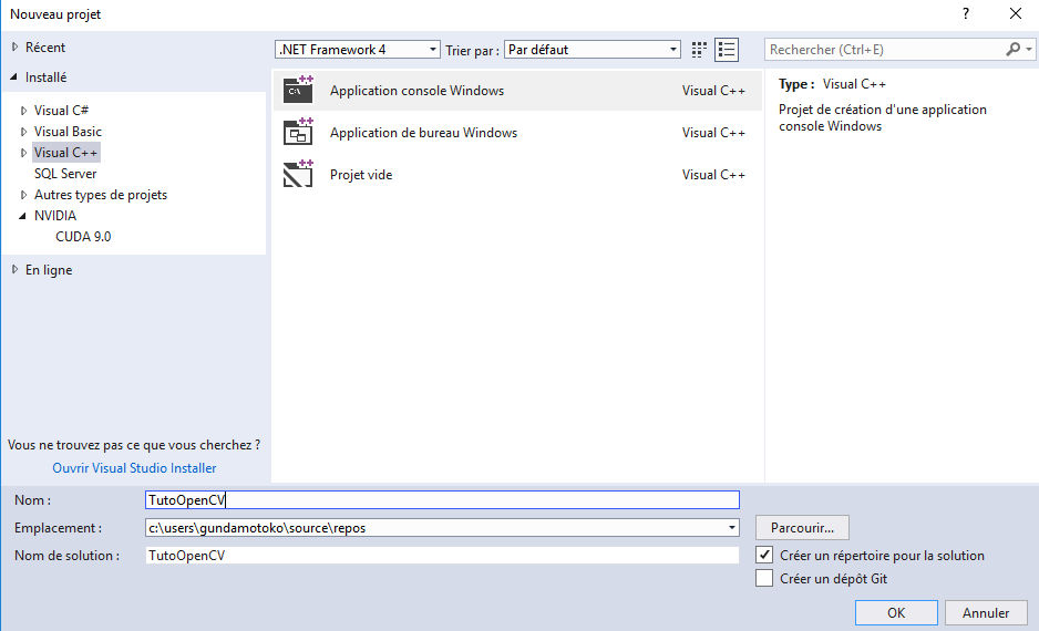 Cliquez sur Visual C++ tout à votre gauche puis sur application console Windows au milieu de la fenêtre. Nommez votre projet « TutoOpenCV » comme montré sur la capture d’écran ci-dessus puis cliquez sur OK.