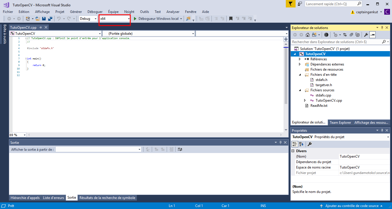 Remplacez x86 par x64 comme sur l’image ci-dessus. Faites un clic droit sur « TutoOpenCV » (encadré en rouge sur la capture ci-dessous) tout à votre droite.