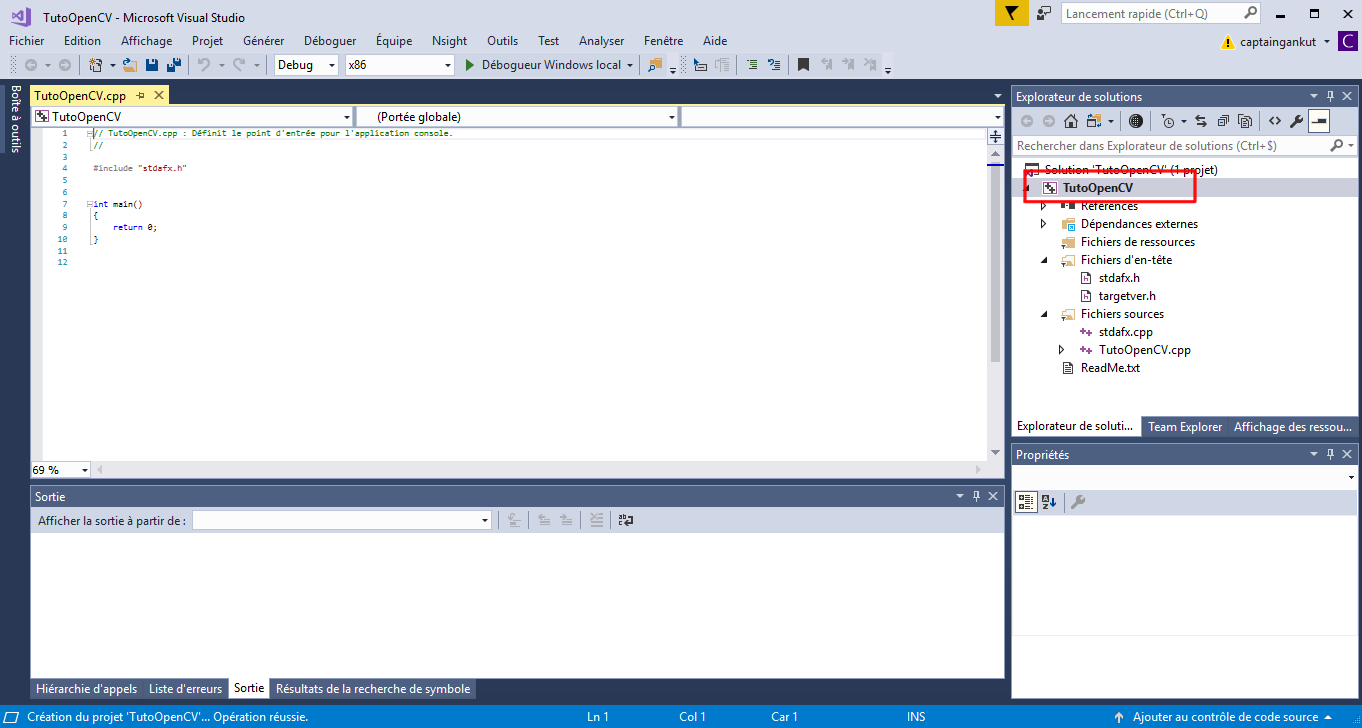 Votre projet est alors configuré pour intégrer du code OpenCV.