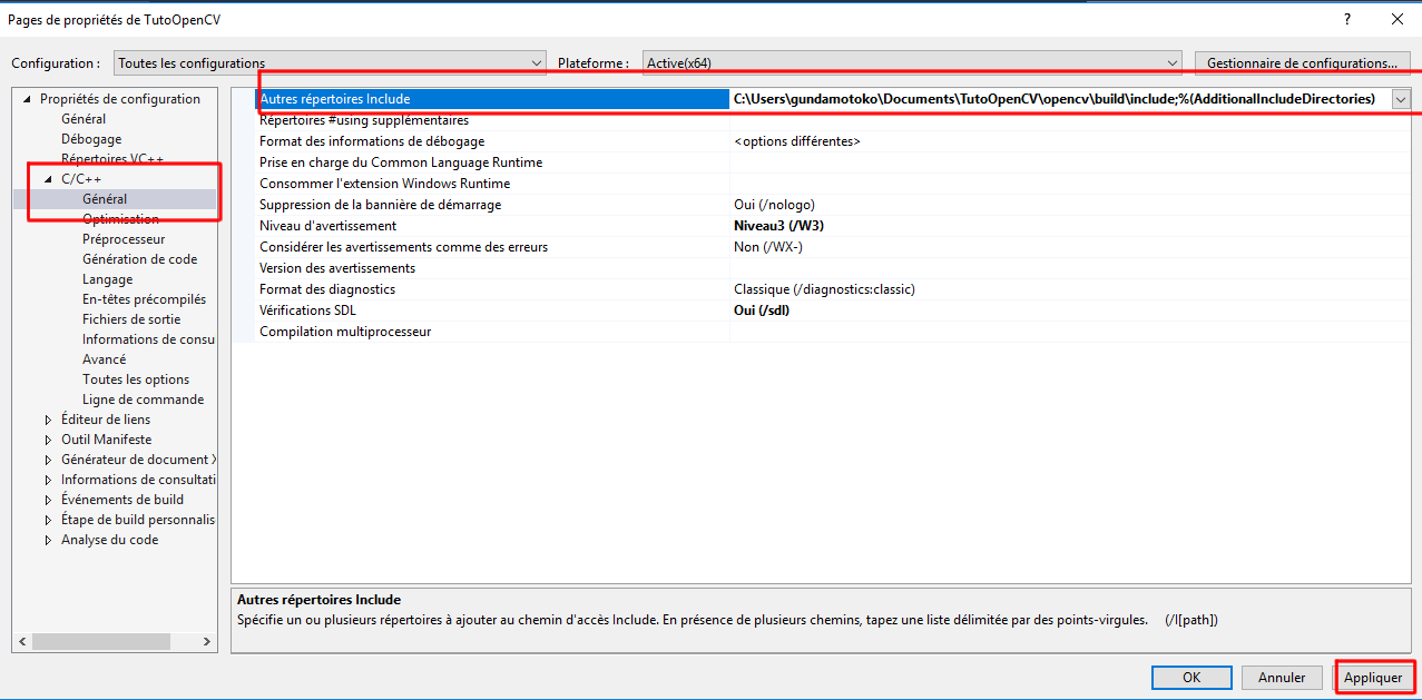 Une fenêtre comme ci-dessous devrait apparaître. Cette fenêtre nous permettra d’indiquer à Visual Studio où se trouve OpenCV. Cliquez sur « C/C++ » puis sur « Général »