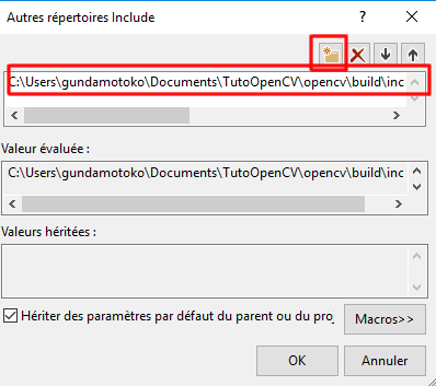 Cliquez sur l’image du dossier, encadré en rouge sur l’image ci-contre. Un champ de texte apparaît alors dans la zone blanche. Cliquez sur les trois petits points à droite de ce champ. Une fenêtre de recherche de répertoire s’ouvrira. À partir de celle-ci, allez dans le répertoire où vous avez extrait OpenCV, cliquez sur « opencv »puis sur « build » et enfin sur « include ». Validez votre choix en cliquant sur sélectionner un dossier. Vous obtiendrez une fenêtre dont le contenu sera proche de celle ci-contre. Cliquez sur « OK ». Une fois la fenêtre fermée cliquez sur « Appliquer » .