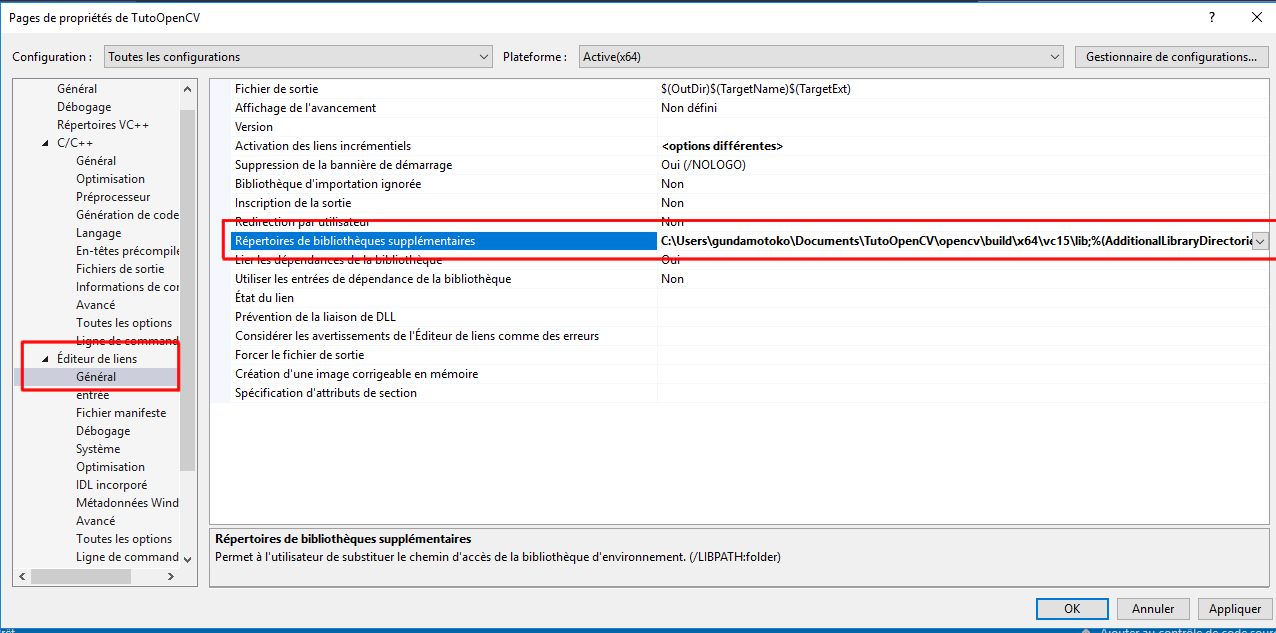 Après avoir indiqué à Visual studio ou se trouvait les headers d’OpenCV, ils vous faudra lui indiquer ou trouver la bibliothèque contenant l’ensemble des fonctions OpenCV. Pour ce faire, cliquez sur « Éditeur de liens », puis sur générale.Une fenêtre comme celle ci-dessous devrait se présenter.