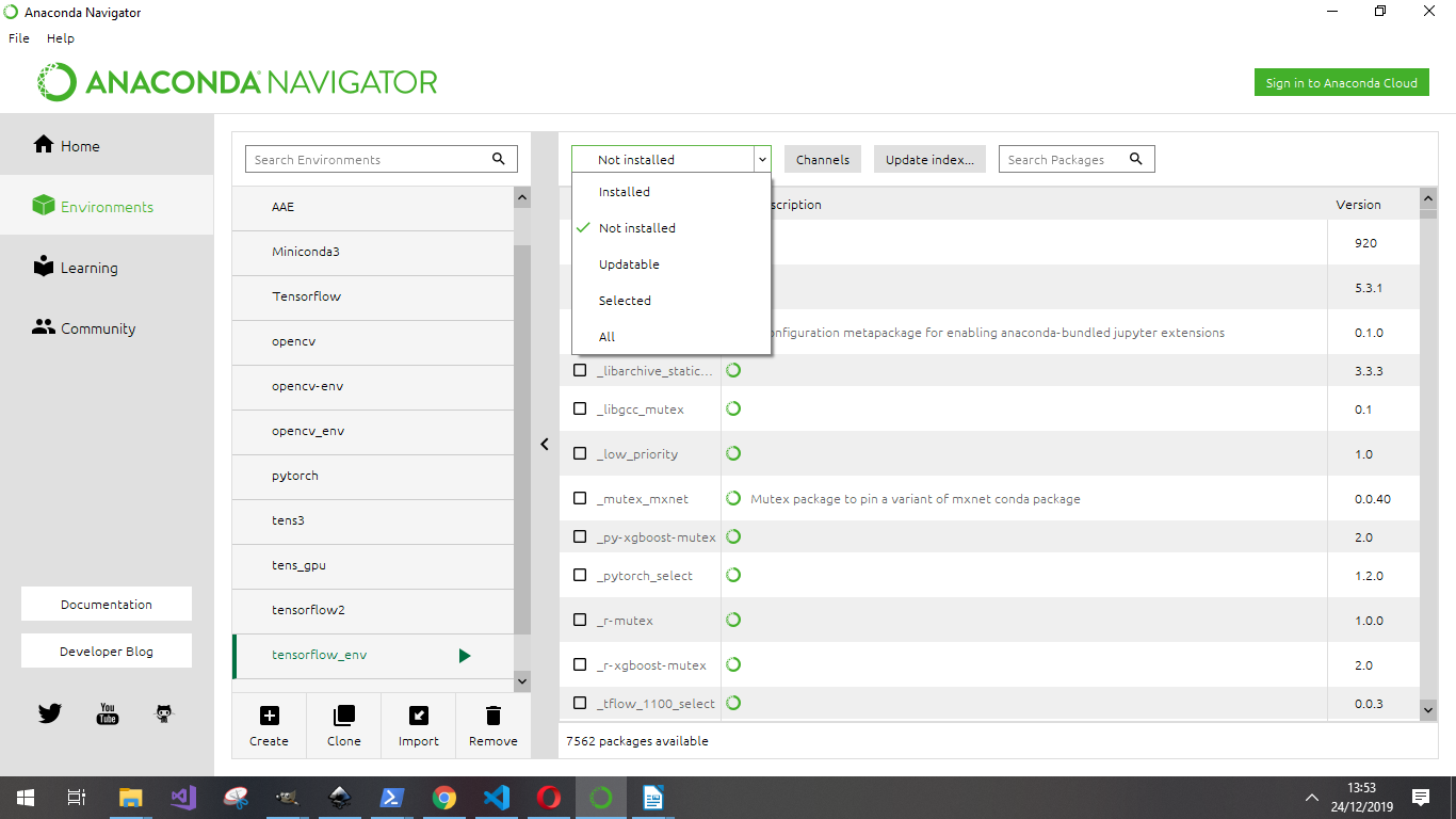 Nommez cet environnement tensorflow_en comme ci-dessus puis choisissez la version la plus récente de python 3.7 à l'heure ou j'écris ces lignes. La fenêtre ci-dessous apparît alors, sélectionner dans la boite de dialogue tout en haut "Not installed". Cela permettra de dire à anaconda que l'on veut accéder à la sliste de tout les packet disponible qui ne sont pas encore installé.
