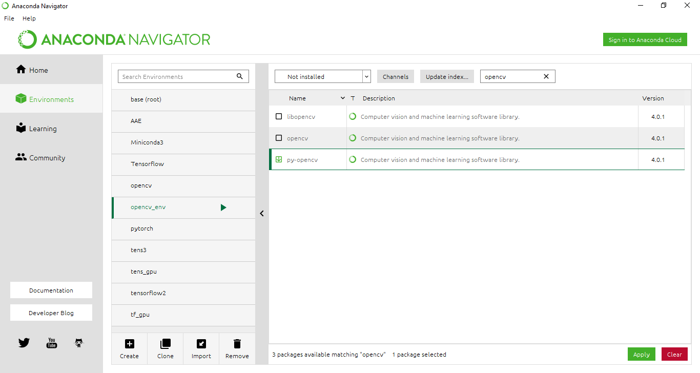Le défaut dans cette première manière d'installer réside dans le fait que vous n'aurez qu'une seule version d'OpenCV pour votre machine. Ce n'est pas tout le temps pratique, surtout dans le cas où vous aimez ramasser du code qui traîne un peu partout sur le Net. Il vous faudra vous assurer qu'il est bien conforme à la version que vous avez sous peine de trainer des erreurs de compilation ou à l'exécution de votre code. Une deuxième possibilité est de passer par le gestionnaire de paquet conda qui a directement été prévue pour pallier à ce problème.