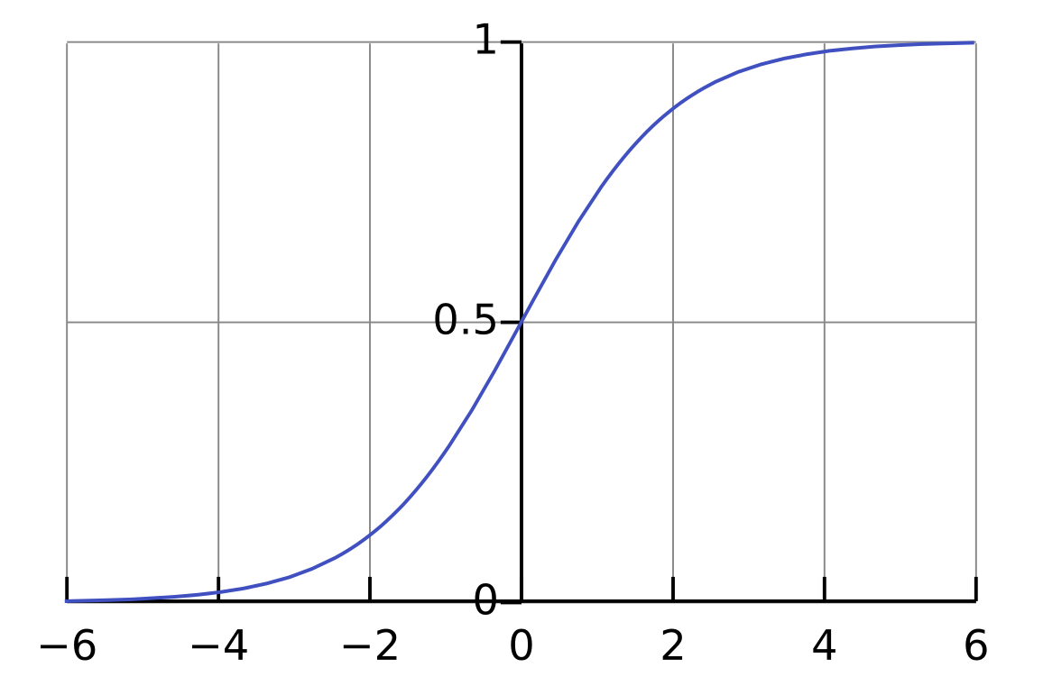 La formule ci-dessus, n'est pas tout à fait vrai. Car lors de la régression logistique, ce que nous cherchons à obtenir c'est la probabilité que Y appartienne à la classe 1 ou à la classe 2. Une probabilité étant comprise entre zéro et un, il faut trouver un moyen de borner le résultat. Cela se fait a l'aide de la fonction logistique qui en faite est la fonction sigmoid très utilisé dans les perceptron multi-couches. Cette fonction est représenté sur l'image ci-dessous: